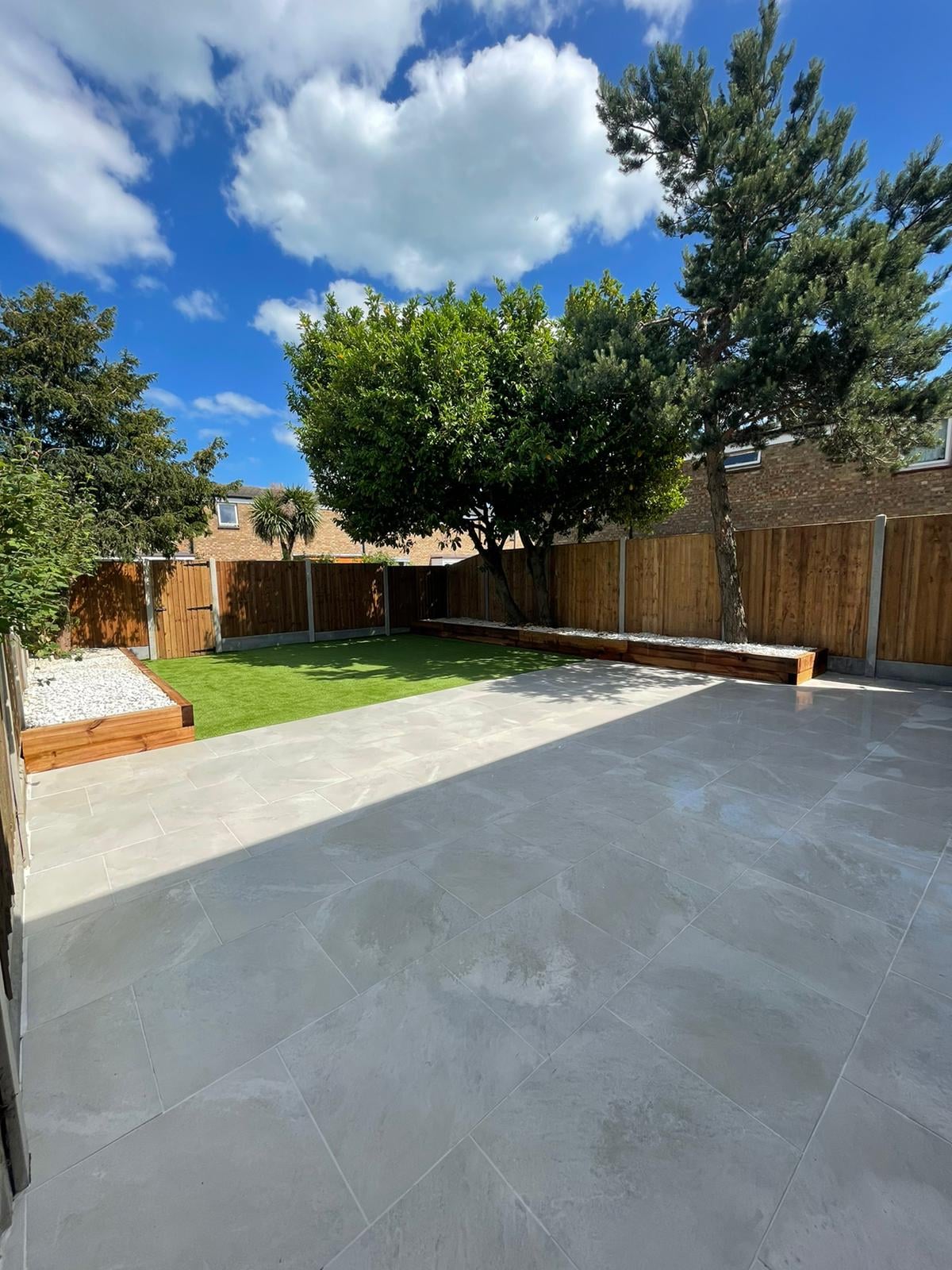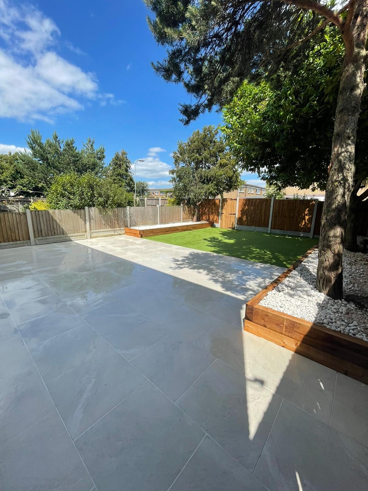A comprehensive project in Shoeburyness, transforming the garden into a modern and functional space. Our team created a beautiful 50m² patio using elegant porcelain tiles.